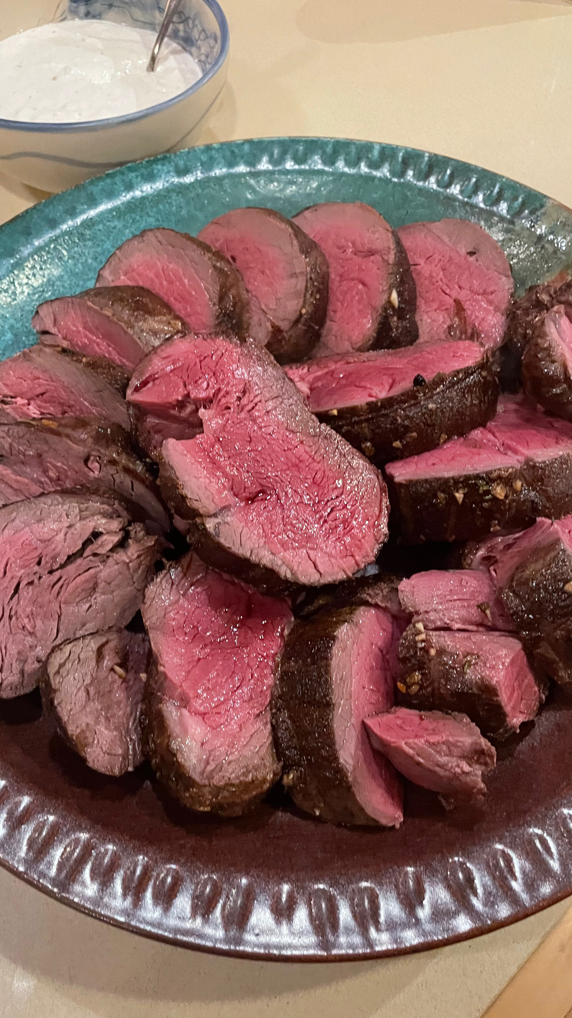 • Meanwhile combine the softened butter, garlic, and herbs in a small dish and mix. Slather the seared tenderloin with the butter mixture and then insert a probe thermometer. If using the skillet, place in preheated oven, or transfer to a baking dish and place in preheated oven. Roast until desired internal temperature is reached, about 20 to 25 minutes. *see notes for temperatures.